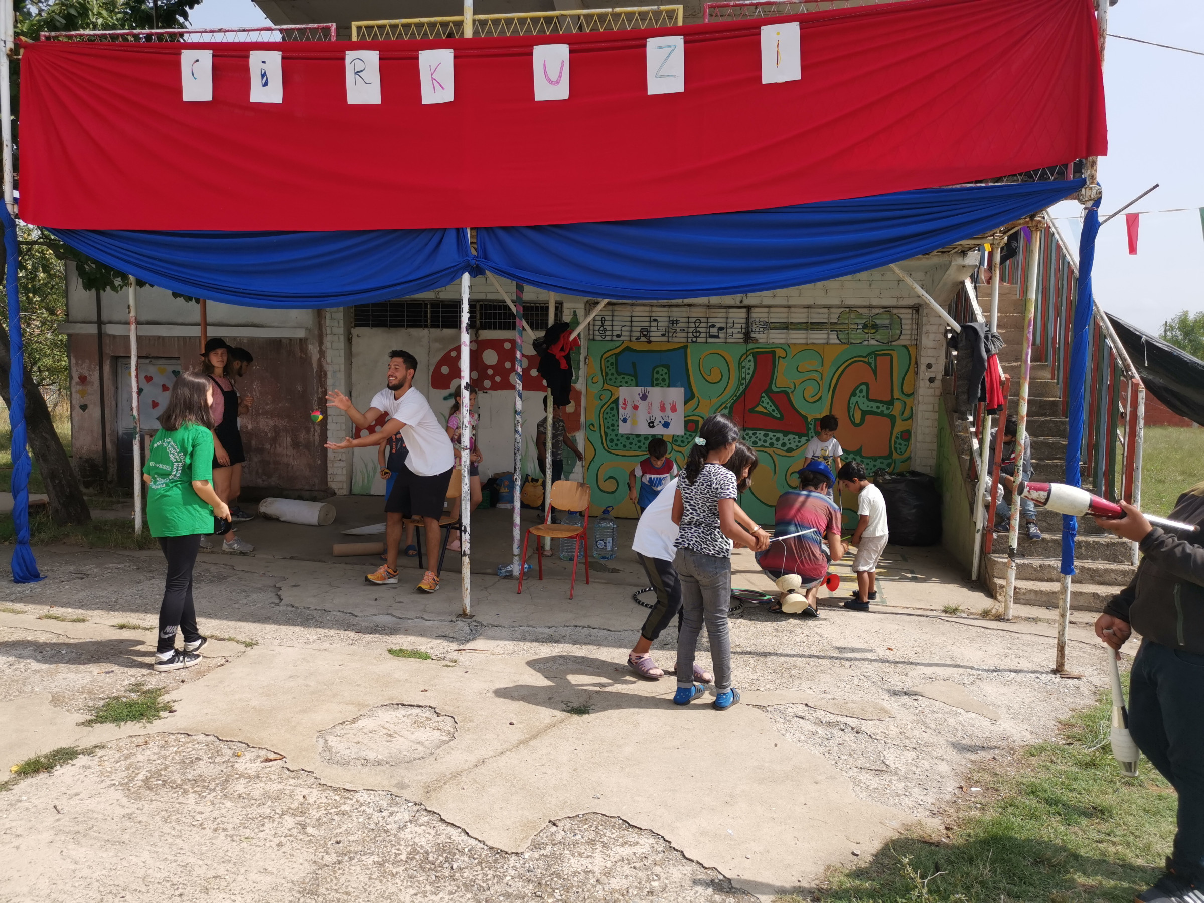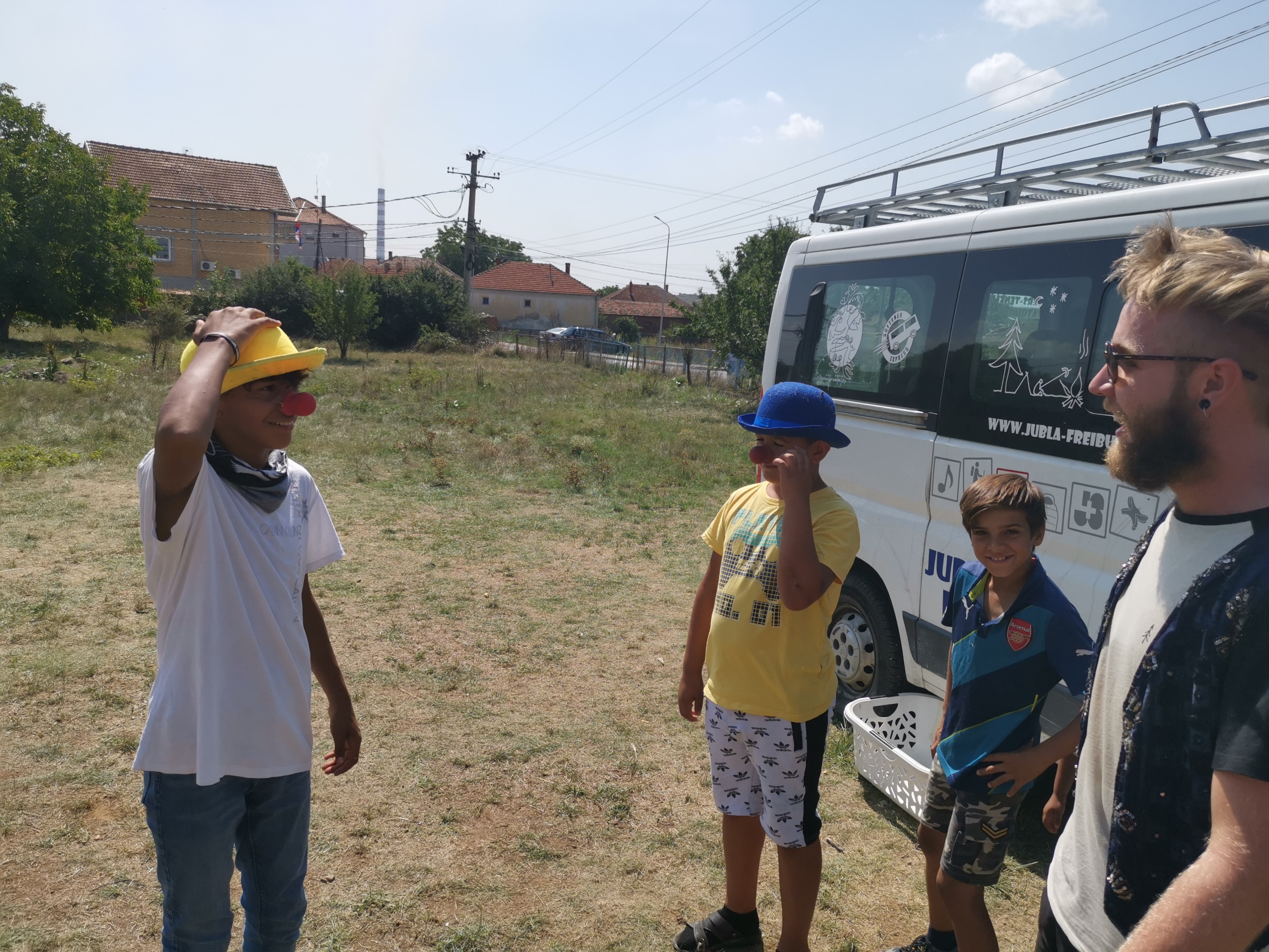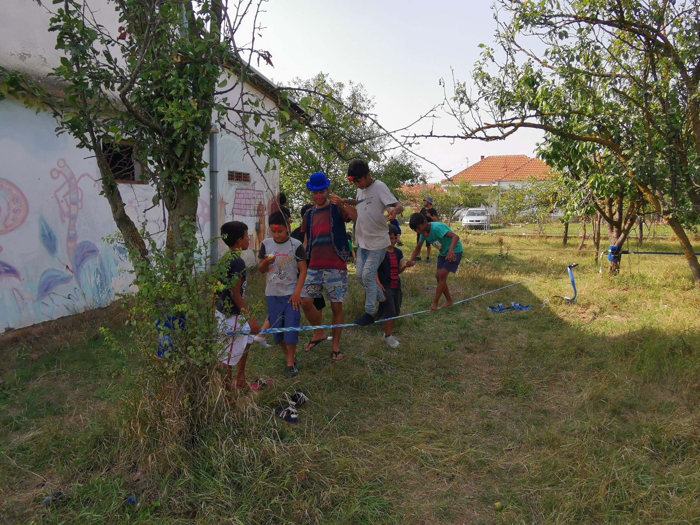 Am ersten Nachmittag gab es ein grosses Ausprobieren. Disziplinen wie Slackline, Jonglage mit Bällen, Keulen oder Tüchern, Diabolo, Poi, Teller, Akrobatik, Fasslaufen und Clowning gab es zu Entdecken. An den folgenden Tagen boten wir jeweils zwei bis drei Disziplinen zum Auswählen. Die meisten Kinder erfreuten sich an der Vielfalt, andere fanden schnell ihre Lieblingsdisziplin und übten fleissig. Die ganze Woche über herrschte Freude auf dem Platz. Allmorgendlich rannten uns die Kinder entgegen und konnten kaum warten, bis es endlich wieder losging. Um in der Gruppe anzukommen, leitete Kani aus der Plementina jeden Morgen ein Spiel an. Anschliessend gab mehrere zirzensische Kurzauftritte für die Kinder, wodurch wir sowohl Disziplinen vorstellten als auch versuchten, den Kindern Inspiration zu geben. Da die meisten Kinder kein Englisch verstanden, übersetzte der junger Roma Besnik für uns.