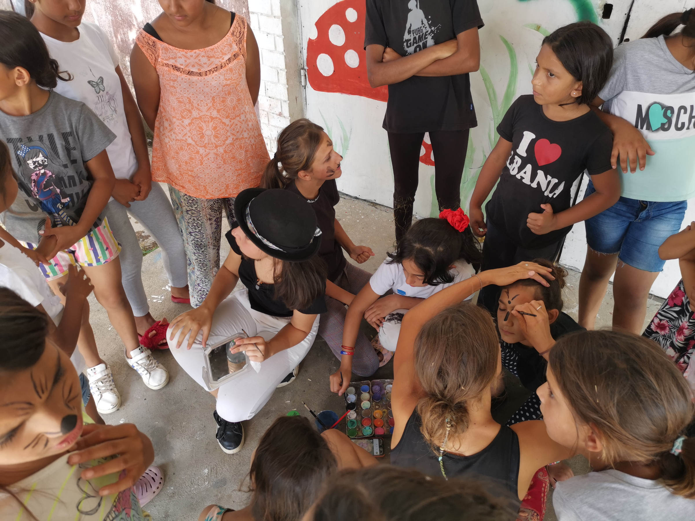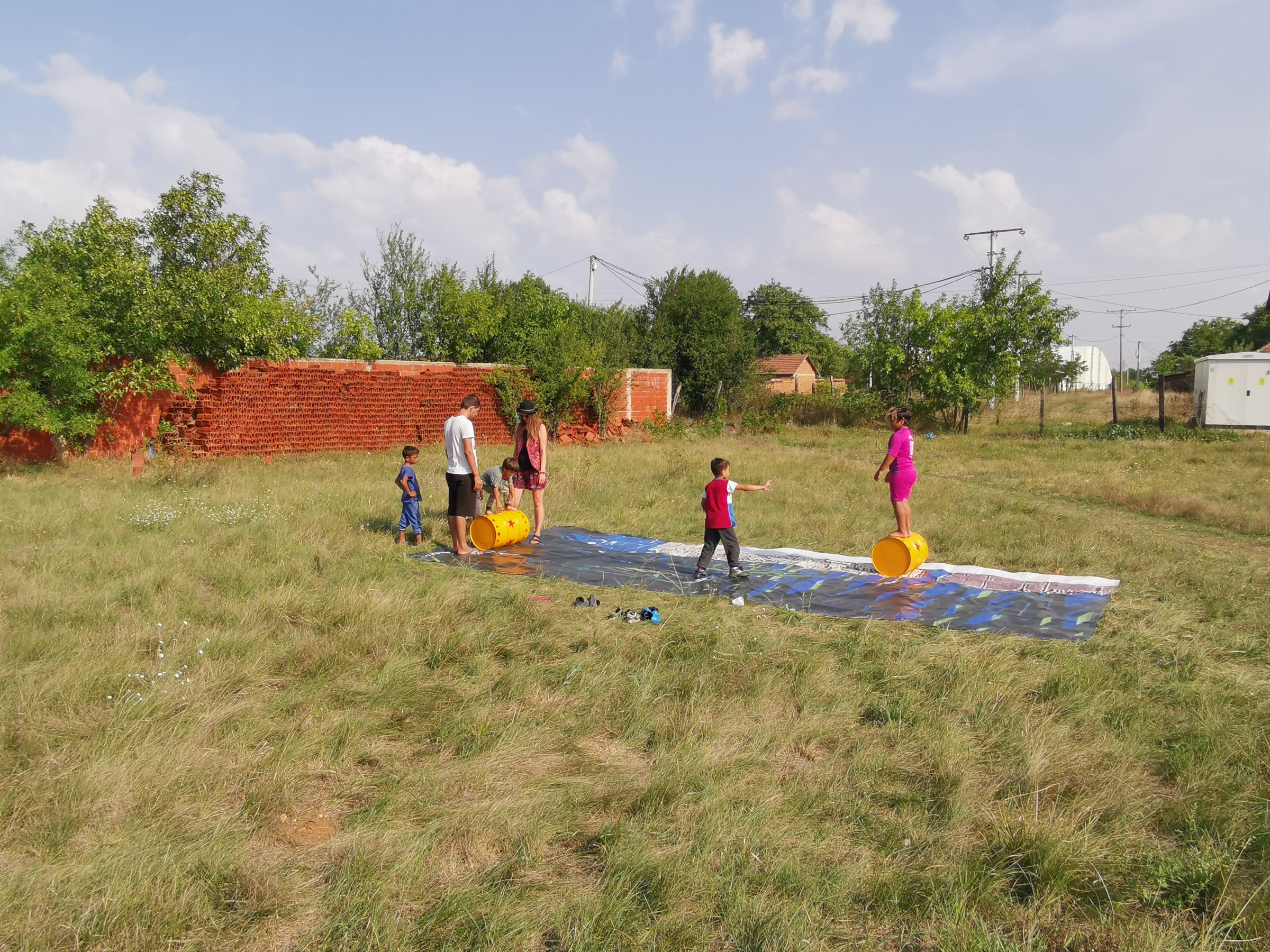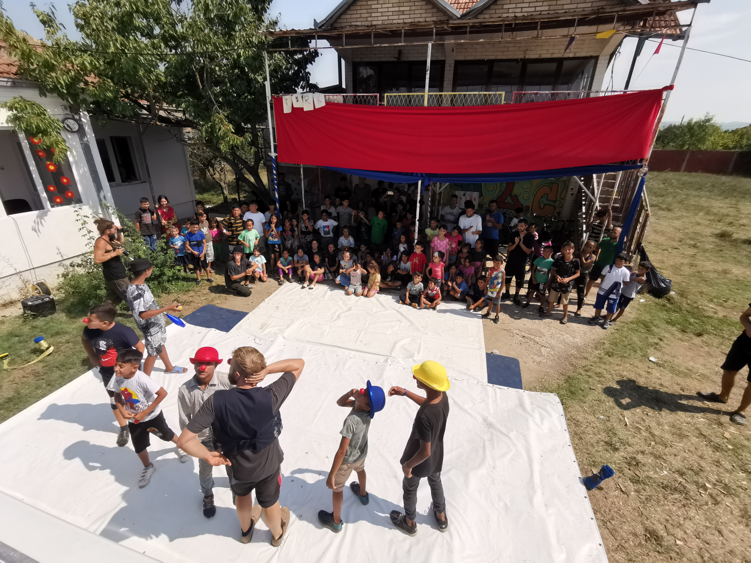 Am ersten Nachmittag gab es ein grosses Ausprobieren. Disziplinen wie Slackline, Jonglage mit Bällen, Keulen oder Tüchern, Diabolo, Poi, Teller, Akrobatik, Fasslaufen und Clowning gab es zu Entdecken. An den folgenden Tagen boten wir jeweils zwei bis drei Disziplinen zum Auswählen. Die meisten Kinder erfreuten sich an der Vielfalt, andere fanden schnell ihre Lieblingsdisziplin und übten fleissig. Die ganze Woche über herrschte Freude auf dem Platz. Allmorgendlich rannten uns die Kinder entgegen und konnten kaum warten, bis es endlich wieder losging. Um in der Gruppe anzukommen, leitete Kani aus der Plementina jeden Morgen ein Spiel an. Anschliessend gab mehrere zirzensische Kurzauftritte für die Kinder, wodurch wir sowohl Disziplinen vorstellten als auch versuchten, den Kindern Inspiration zu geben. Da die meisten Kinder kein Englisch verstanden, übersetzte der junger Roma Besnik für uns.